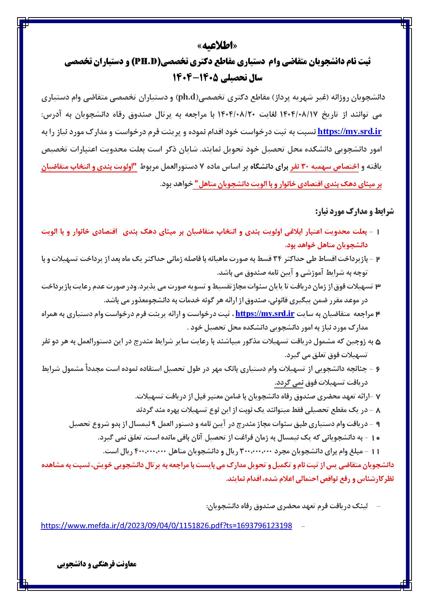 اطلاعیه ثبت نام متقاضیان وام دستیاری و مقاطع دکتری تخصصی (ph.d) و دستیاران در سال تحصیلی 1404-1405