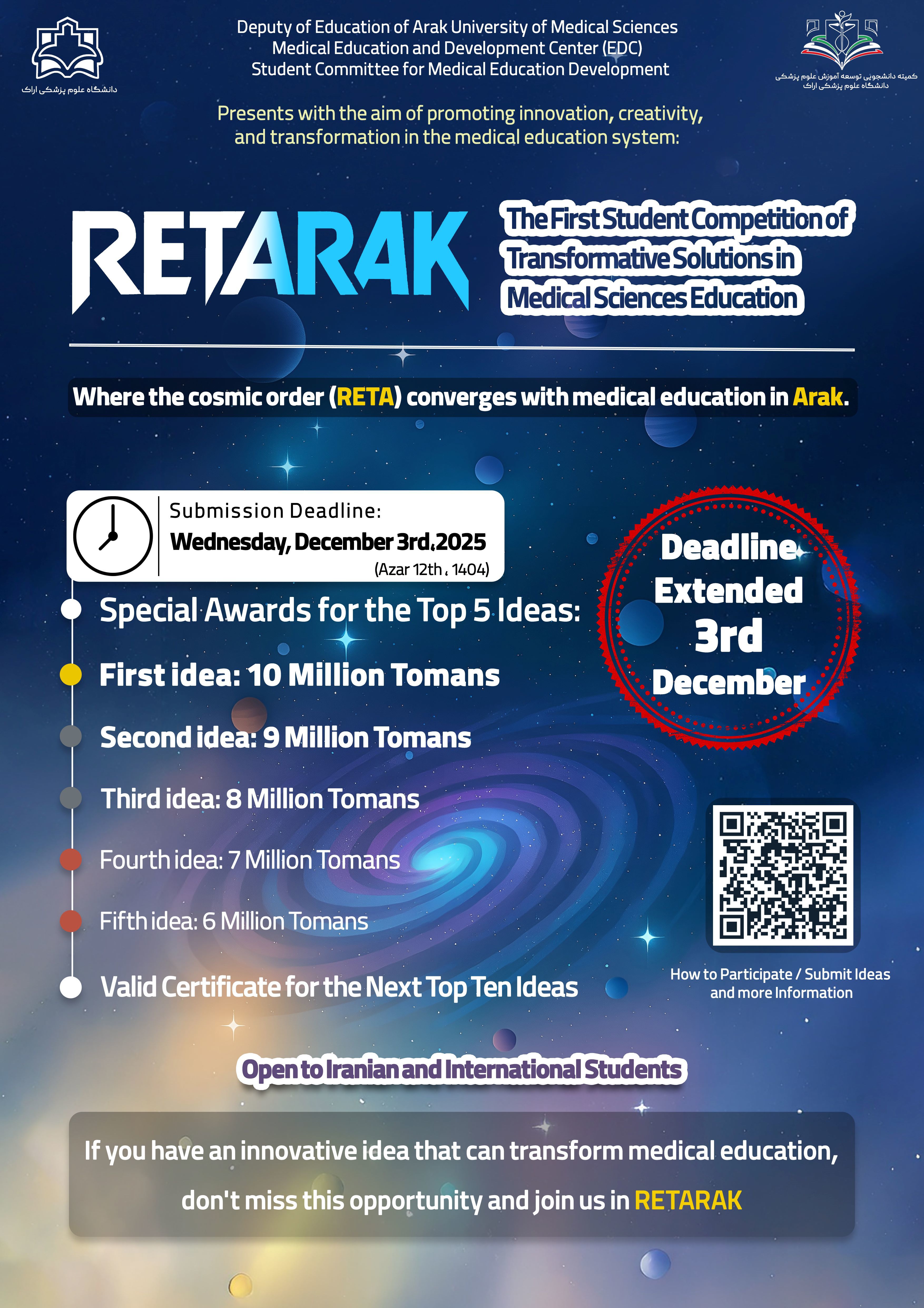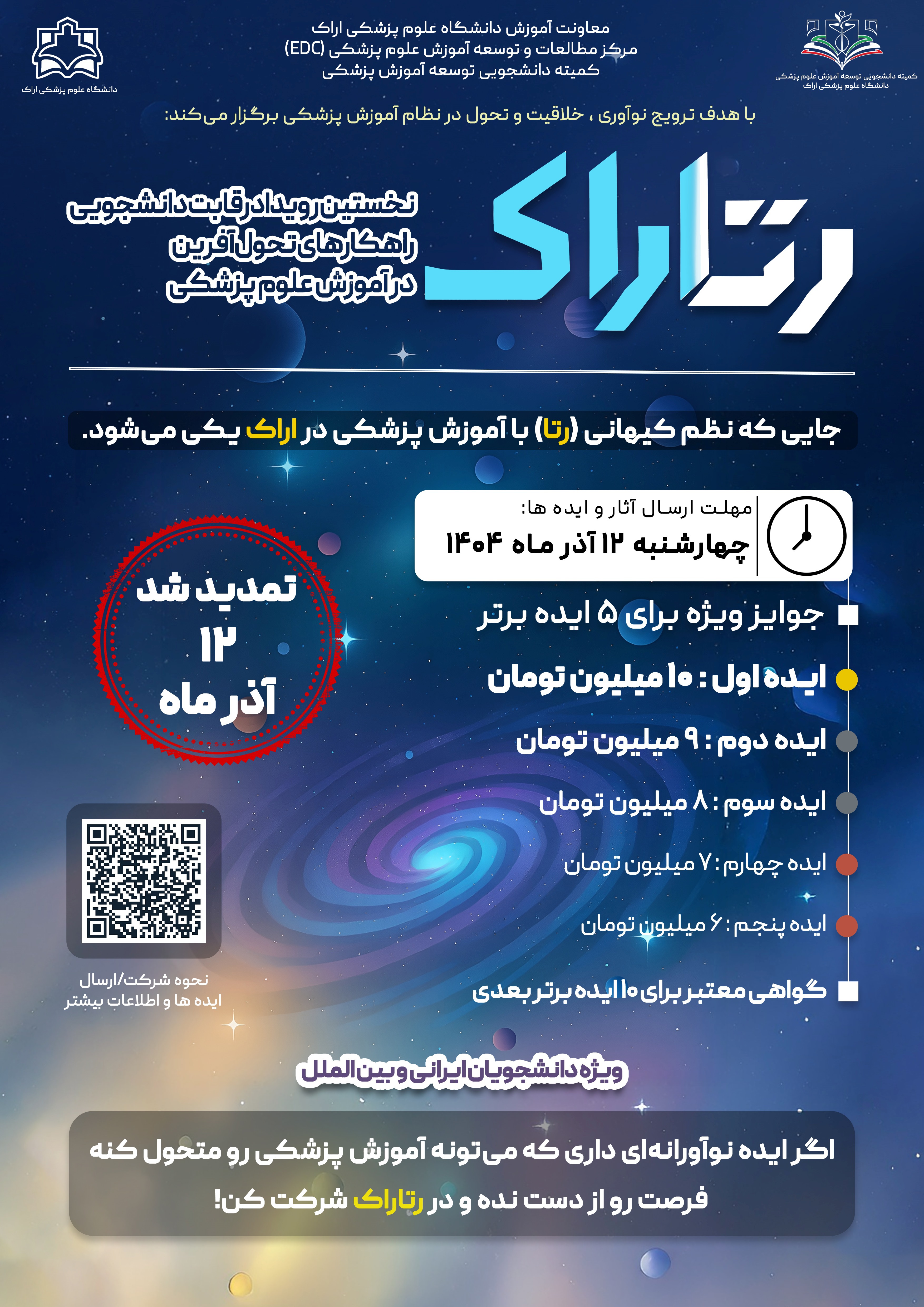 باتوجه به تقاضای مکرر دانشجویان بین الملل و همچنین درخواست های متعدد دانشگاه های علوم پزشکی سراسر کشور،بدین وسیله به استحضار میرساند که مهلت ارسال آثار در بخش کشوری رویداد تا پایان روز چهارشنبه 1404/09/12تمدید گردید.