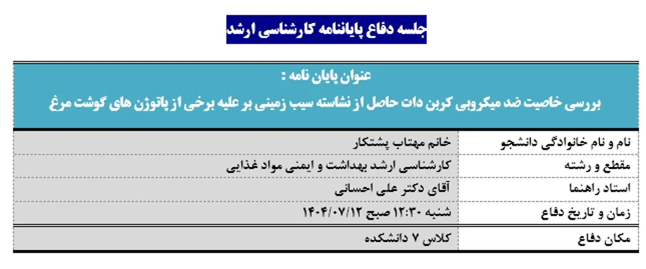 جلسه دفاع پایان نامه کارشناسی ارشد خانم مهتاب پشتکار (شنبه 1404/07/12)