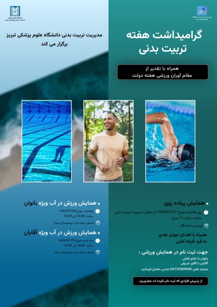 مدیریت تربیت بدنی دانشگاه به مناسبت گرامیداشت هفته تربیت بدنی، همایش پیاده روی و ورزش در آب را همراه با مراسم تجلیل از مقام آوران هفته دولت، برگزار می نماید. از کلیه همکاران دعوت میگردد جهت ثبت نام در وقت اداری به مدیریت تربیت بدنی (خانم فنائی و آقای مقدم شریفی) مراجعه نمایند .