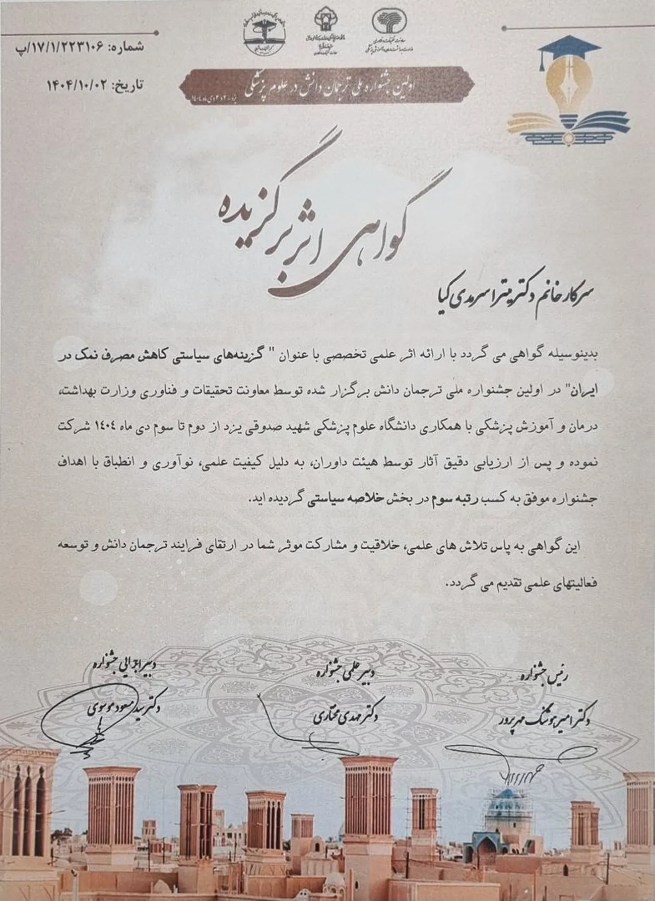 کسب رتبه سوم در نخستین جشنواره ملی ترجمان دانش در علوم پزشکی، افتخاری ارزشمند و شایسته تقدیر است. این موفقیت بیانگر توانمندی علمی، رویکرد نوآورانه و تلاش موثر در راستای ترجمان، ترویج و کاربردیسازی دانش در حوزه علوم پزشکی میباشد.