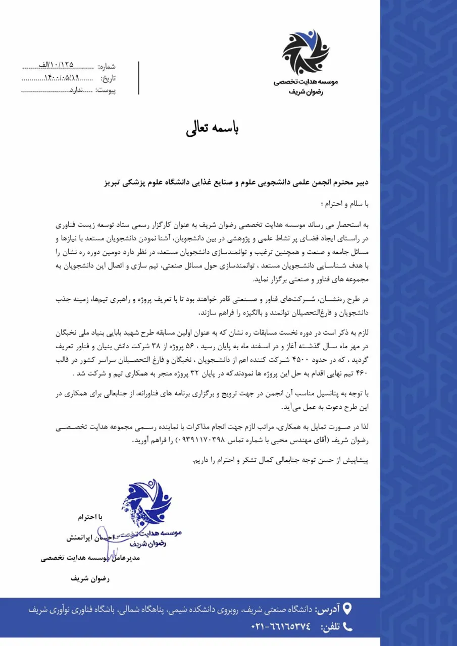 دعوتنامه از سوی کارگزار رسمی ستاد توسعه زیست فناوری و بنیاد نخبگان جهت انتخاب نمایندگی و همکاری انجمن علمی علوم و صنایع غذایی در دانشگاه