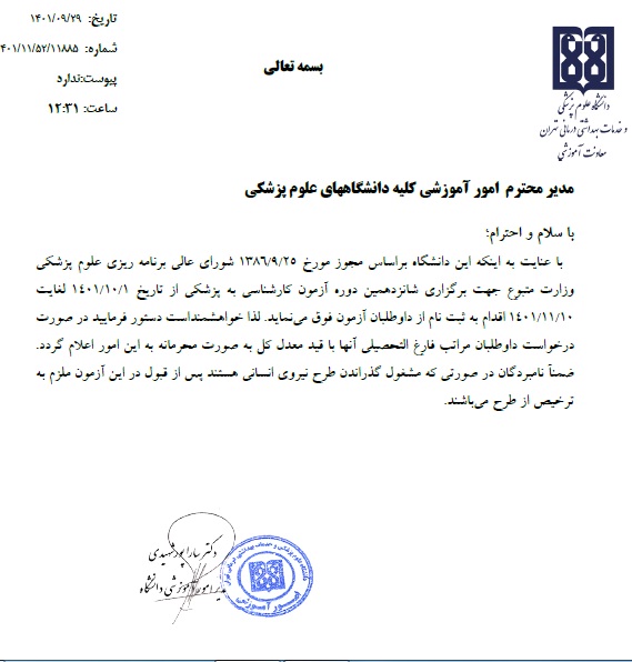 داوطلبان گرامی جهت ثبت نام میتوانند از روز پنجشنبه اول دیماه 1401 لغایت دوشنبه ده بهمن ماه 1401 با مراجعه به سایت معاونت آموزشی دانشگاه علوم پزشکی تهران و اسکن مدارک نسبت به ثبت نام خود اقدام نمایند. بدیهی است هرگونه مغایرت مدارک ارائه شده با دستورالعمل موجب کان لم یکن تلقی شدن ثبت نام از طرف دانشگاه خواهد شد.