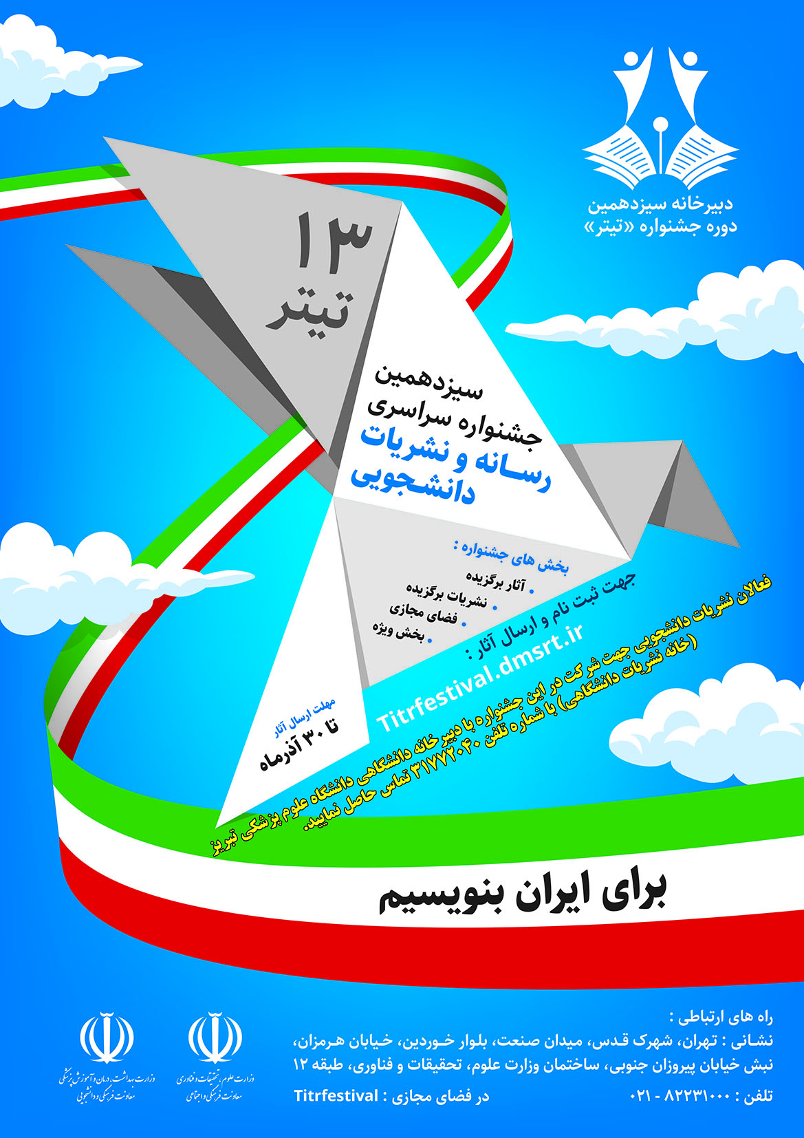 سیزدهمین جشنواره سراسری رسانه و نشریات دانشجویی «تیتر ۱۳» با شعار «برای ایران بنویسیم» برگزار می شود.