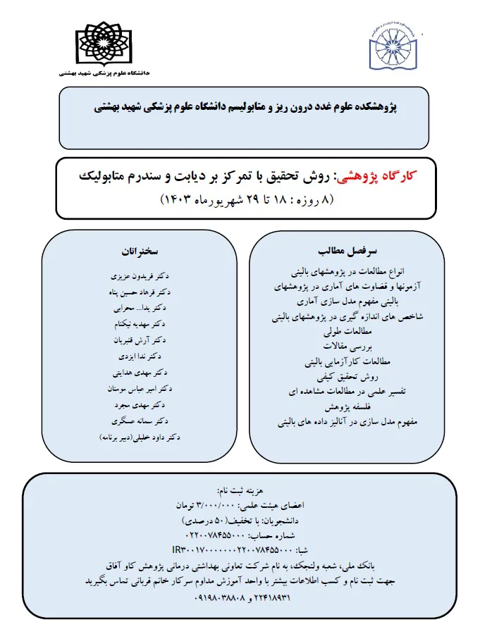 به اطلاع علاقمندان میرساند کارگاه روش تحقیق با تمرکز بر دیابت و سندرم متابولیک در تاریخ ۱۸ لغایت ۲۹ شهریور ماه سال 1403 و به میزبانی دانشگاه علوم پزشکی شهید بهشتی برگزار می شود.