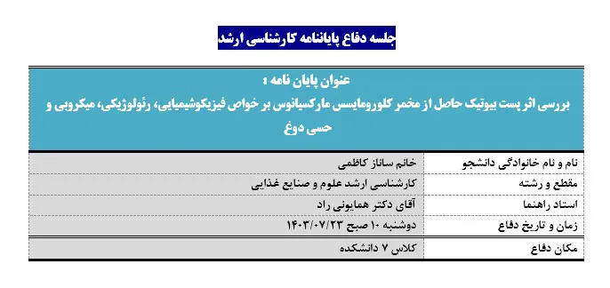 عنوان پایان نامه: بررسی اثر پست بیوتیک حاصل از مخمر کلورومایسس مارکسیانوس بر خواص فیزیکوشیمیایی، رئولوژیکی، میکروبی و حسی دوغ