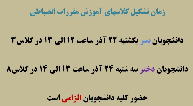 برگزاری کارگاه آموزشی مقررات انضباطی ویژه دانشجویان کارشناسی ورودی 94 شرکت در جلسات الزامی است کد خبر : 59314 کپی